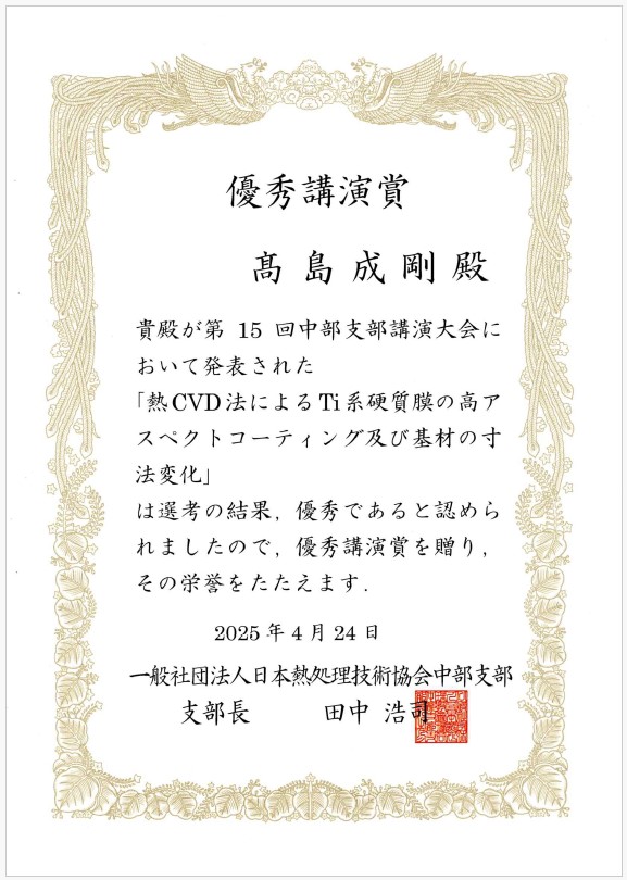 4月24日(水)に開催された(一社)日本熱処理技術協会 第15回中部支部講演大会で、弊社の髙島室長が優秀講演賞を受賞しました。